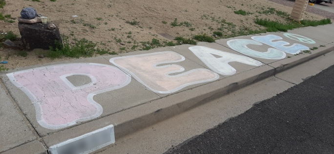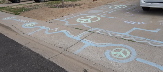 As the Russians invaded Ukraine, I painted the word "PEACE" really big in chalk on the sidewalk in front of my house. It's long gone, but today I discovered that it's still visible in the satellite photos on Google Maps! You can just make out the big peace sign in the driveway.